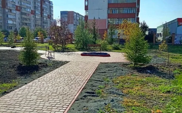 Также в летние месяцы проведены строительные работы по благоустройству территории: отсыпка песком, изготовление из тротуарной плитки площадки с клумбой и площадки с искусственным водоемом, пешеходных дорожек, соединяющих площадки.