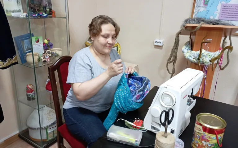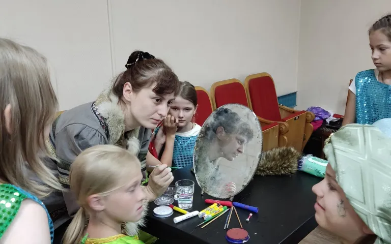 В комнате для репетиций на столе стояли – предметы, необходимые актёрам по ходу действия спектакля. Это реквизит, который в течение часа переходил из рук в руки на репетициях. А вот в пошивочный цех, где ставили чум и сшивали «шкуры»- можно было только посмотреть, так как времени на пошив костюмов совсем не осталось. Нисколько не расстроились «актёры», так как впереди ещё много у них творчества и позитива!