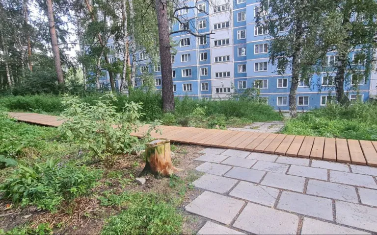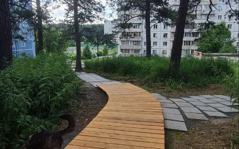 Идея эко-благоустройства в лесочке внутри микрорайона пришла с желанием сохранить кусочек природы и сделать его комфортным для детей и жителей. Микрорайон окружает великолепный лес, но сейчас дети много учатся и конечно мало посещают природу в свободное время. Путь к школе «напрямки» был затруднен в-связи с неудовлетворительным состоянием тропинок и лестниц и свободно гуляющими собаками. В ближайшие годы планируется поэтапное благоустройство, организация собачьей площадки, зон тихого отдыха внутри лесочка, арт-объектов и ландшафтных композиций, а также детской площадки 7+ на периферии участка. Первым этапом решили вопрос с комфортабельностью и безопасностью пешеходного фрагмента по лесочку до школы. Реализовано 70 метров деревянного настила, шириной 1,5 м, на котором комфортно расходятся 2 человека.
