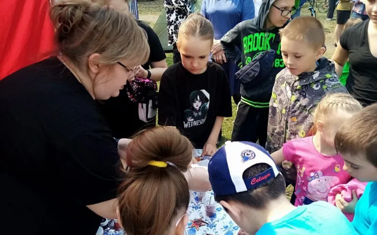 На праздничной площадке были организованы: мастер-класс (мастер Барышникова Оксана Александровна) по изготовлению сувениров с праздничной символикой; совместно с ВОД «Волонтеры Победы» акция «Символ Победы»- каждому жителю и гостям на входе выдавалась георгиевская ленточка; выставка детских рисунков «Рисунок Победы»; выставка «Гармонь на дорогах войны»; «Стена памяти»; «Бессмертный полк» - макет, изготовленный учеником 6б класса ТЛИ √128 Трофимовым Сергеем совместно с бабушкой, Ковырюшиной Л.А.; акция «Лента памяти» , в которой каждый, пришедший на праздник, принял участие - повязал свою, ленту на красную звезду- символ памяти и вечного огня; военная инсталляция «В лесу прифронтовом», а для самых маленьких была организована игровая зона с игрушками.