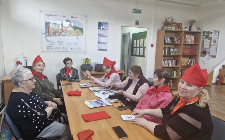 Встреча Литературной гостиной стала живым мостиком в прошлое, участницы окунулись в атмосферу тех времён: все участники были в красных галстуках и пилотках, вспоминали пионерские традиции и, конечно же, в конце дружно спели любимые песни «Взвейтесь кострами» и «Картошка…»!
