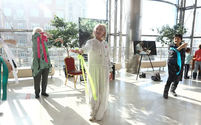 Большое помещение разбили на три зоны. На площадке для физического здоровья гостей научили массажу, работе на спортивных тренажёрах, растяжке и укреплению мышц, провели групповую зарядку для спины и суставов.
