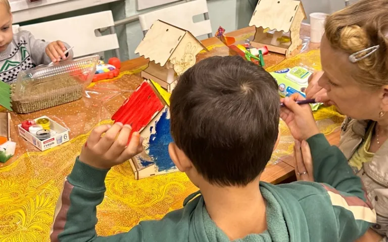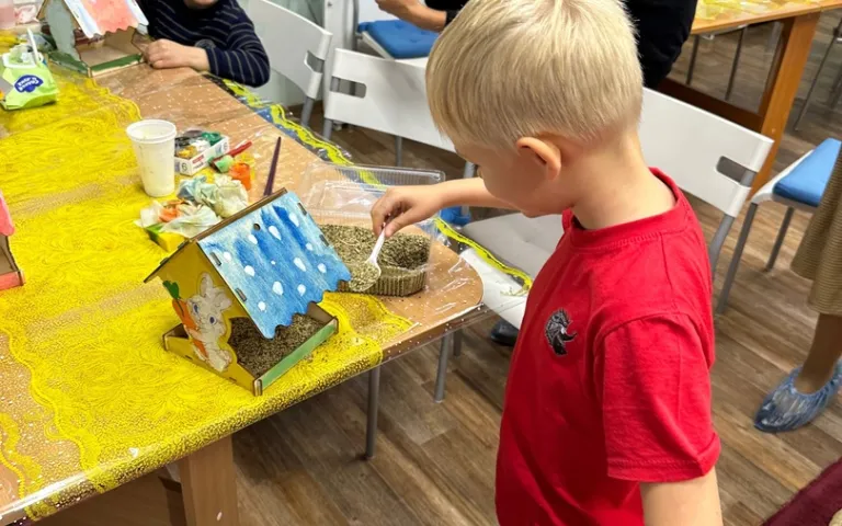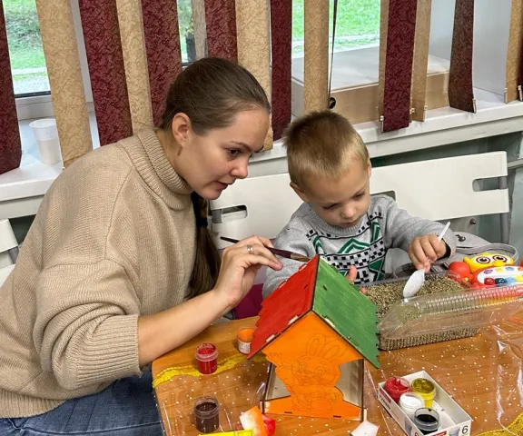 Тишина на занятии, улыбки на лицах детей и мам, прекрасные яркие кормушки свидетельствуют о правильно и органично подобранной теме и профессионализме нашего мастера Елены Соловьевой, работающей с ребятами.