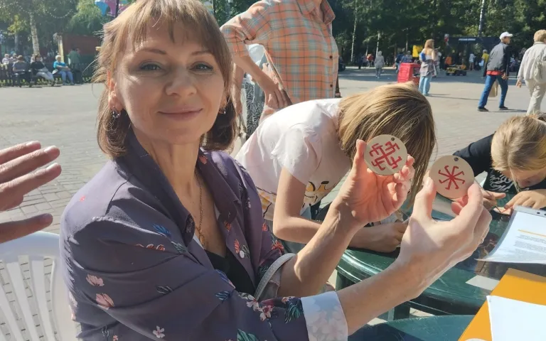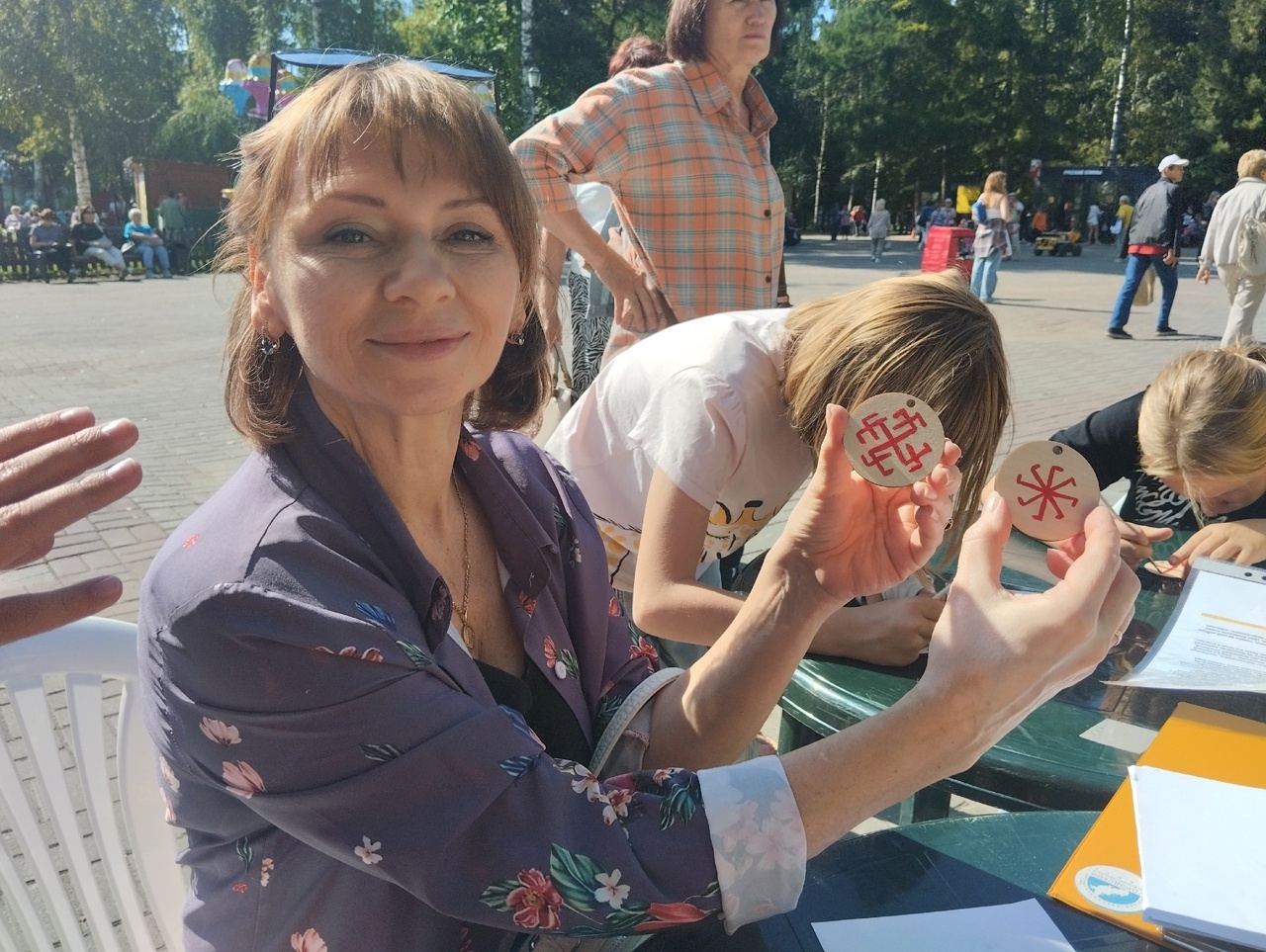 Более серьезным стал мастер-класс по изготовлению оберега на деревянной основе. Участники сначала изучали символику славян, потом пробовали нарисовать выбранный символ на листе бумаги и только после этого наносили его на деревянный круг. Каждый в итоге надел на шею оберег, выполненный своими руками.