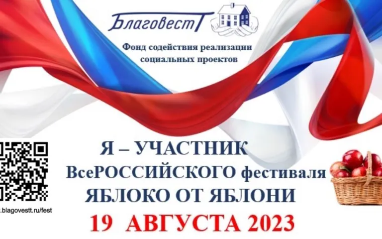 Фонд Содействия реализации социальных проектов «БЛАГОВЕСТ» приглашает принять участие во Всероссийском Фестивале «Яблоко от яблони», во время которого, одновременно в один день проводятся мероприятия (тематические, патриотические, творческие, кулинарные) во всех регионах России, что способствует духовному единению людей, сохранению семейных ценностей, патриотическому воспитанию детей и молодежи, преемственности поколений, укреплению жизненной и духовной силы каждого человека и всего народа России в целом.
