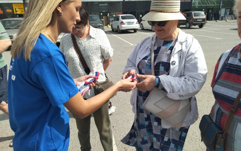 Волонтёры Летнего Трудового Отряда ТОС «Бронный» раздавали зрителям 111 ленточек (триколор) в цветах российского флага.