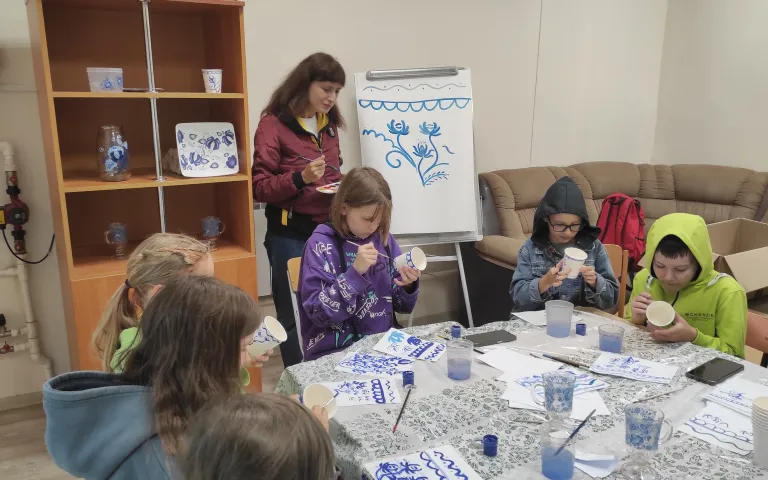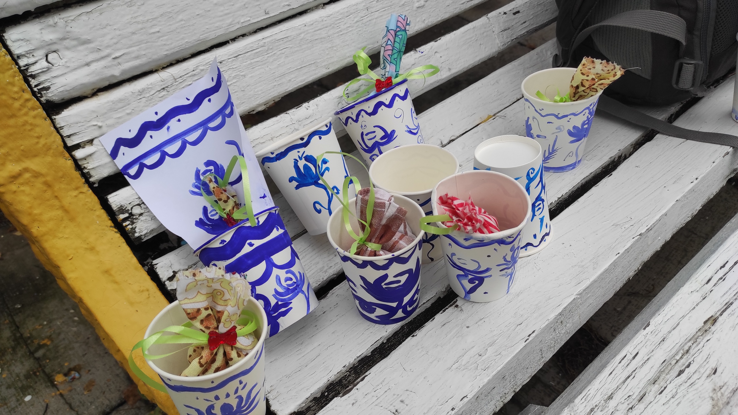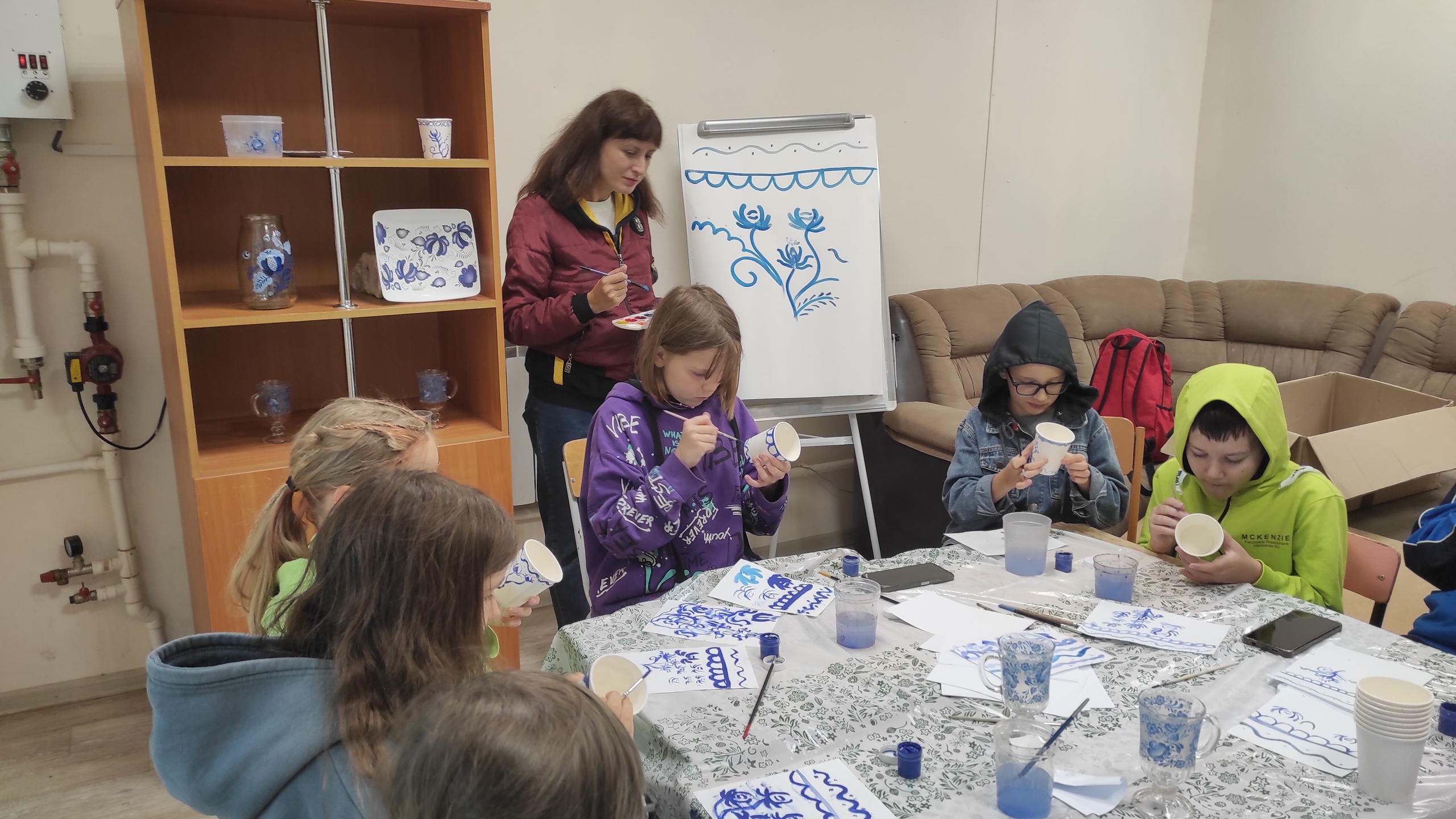 На одной – детям представили основные принципы русского народного промысла «Гжель» – и каждый попробовал расписать себе бумажный стакан.
