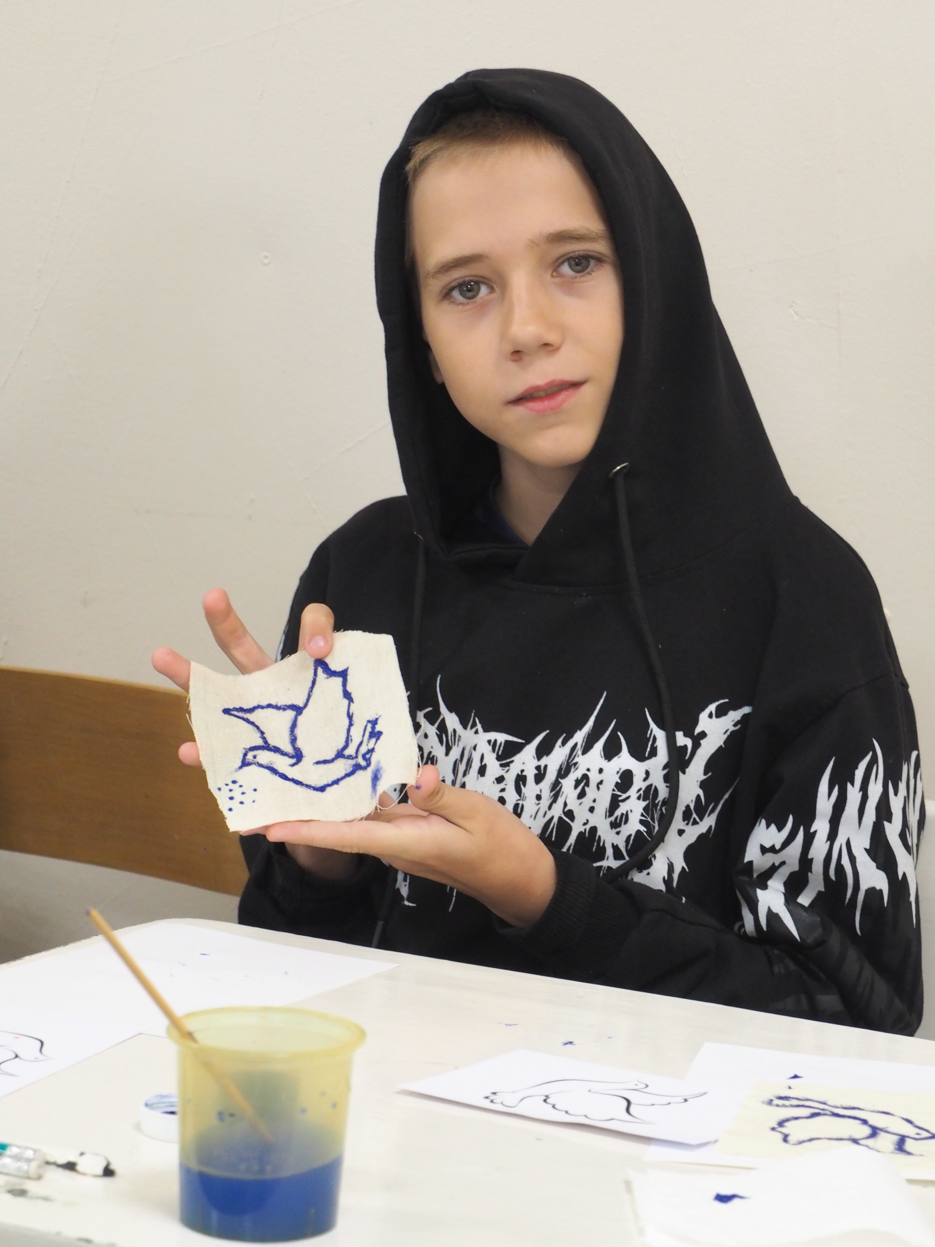 На мастер-классе по росписи решили работать только с синей краской. Простейшие повторяющиеся элементы в виде орнамента детям освоить не составило труда, а вот узоры в виде цветов, листьев, завитушек на ровном листе бумаги заставили некоторых серьёзно постараться. Ведь впереди их ждал одноразовый бумажный стаканчик, который предстояло расписать уже опробованными элементами. В результате получились отличные стаканчики в стиле гжельской росписи, которые к тому же можно использовать по прямому назначению, – например, выпить из них вкусный чай с ароматными травами.