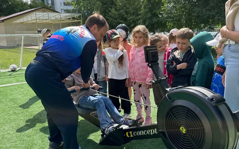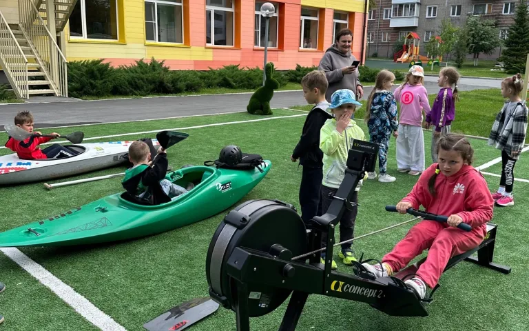 Привозили в детский сад «Жарки» гребной тренажер и лодки с веслами, чтобы дети узнали о виде спорта «гребной слалом», о разнице между каяком и каноэ, попробовали себя в качестве настоящих спортсменов-гребцов.
