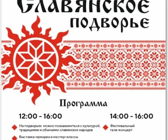 В рамках программы фестиваля предусмотрена работа национальных подворий, демонстрирующих особенности культуры и быта того или иного славянского народа. Выставки декоративно-прикладного творчества и дополняющие их мастер-классы позволят ещё больше погрузиться в атмосферу праздника, сделав традиционный памятный сувенир своими руками. Творческие коллективы, в свою очередь, представят свои лучшие концертные номера на сценической площадке парка “Берёзовая роща”. Будет на фестивале и интерактивная программа для самых юных гостей – традиционные народные игры славянских народов.
