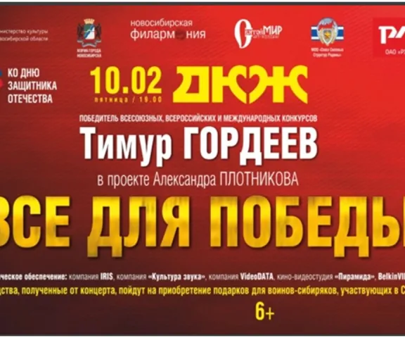 10 февраля 2023 года в 19:00, в Новосибирском Дворце культуры железнодорожников состоится большой концерт обладателя гран-при всероссийских и международных конкурсов Тимура Гордеева, «Всё для Победы». Организаторами концерта являются; поэт Александр Плотников, певец Тимур Гордеев, Арт-холдинг «Святой мир» и Межрегиональная общественная организация ветеранов силовых структур «Союз Силовых Структур Родины». Основой концертной программы «Всё для Победы» стали песни новосибирских авторов о героях Специальной военной операцией на Украине и легендарные песни военных лет. В концерте «Всё для Победы» участвуют ведущие мастера искусств Новосибирска: Новосибирская хоровая капелла под руководством народного артиста России Игоря Юдина, фольклорный ансамбль «Рождество» под руководством заслуженного деятеля искусств России профессора Ольги Гуриной, инструментальный ансамбль «Солнцемаяк» под руководством Святослава Мелика, Ансамбль музыки для народа «Дружина», Ансамбль песни и пляски Сибирского округа войск Национальной гвардии РФ, солисты; заслуженная артистка России Дилара Варфоломеева, Лауреаты всероссийских и международных конкурсов Тамара Сидоренко, Елена Марченко, Виктория Сухарева, Артём Старченко и др.