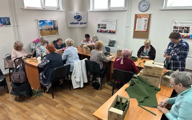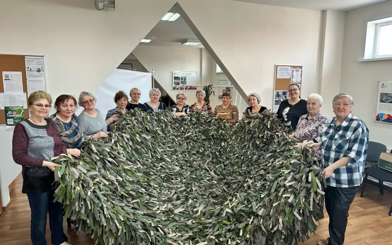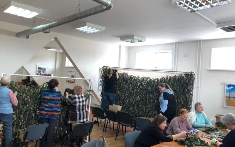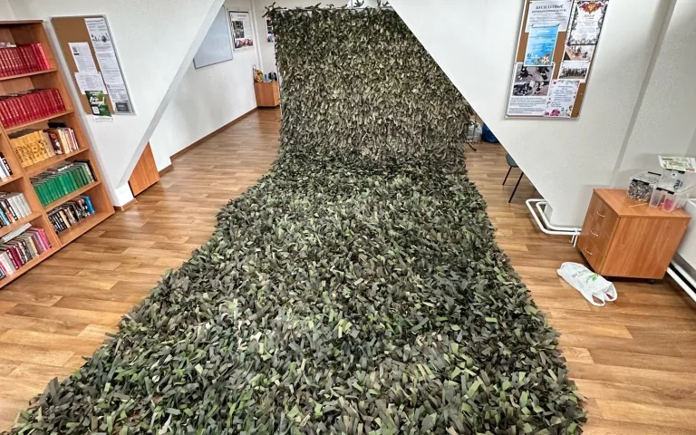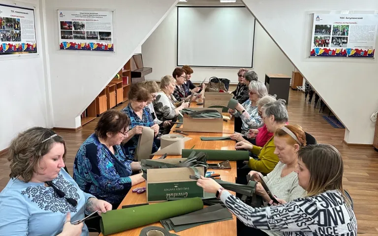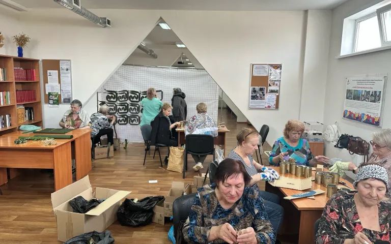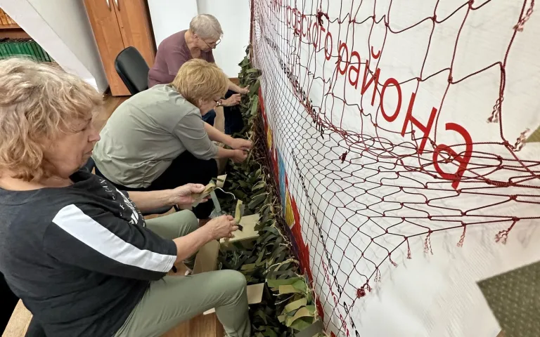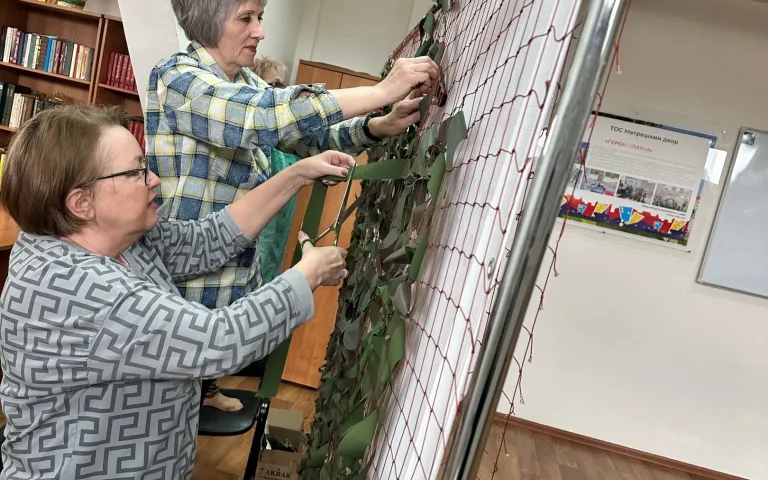 В Ресурсном центре по ул.Петухова,95/1 по инициативе ТОС «Матрёшкин двор» с марта кипит работа по изготовлению заготовок блиндажных свечей, а теперь ещё и по изготовлению маскировочных сетей. Как только у общественников появляется свободное время, они приходят сюда, чтобы сделать как можно скорее очередную сетку.