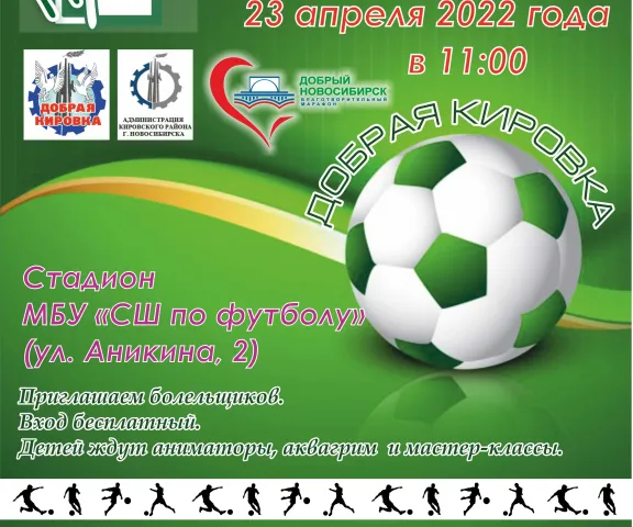 В рамках «Весенней Недели Добра» 23 апреля на стадионе МБУ «СШ по футболу» по адресу: город Новосибирск, ул. Аникина, 2 прошёл Благотворительный турнир по мини-футболу «Добрая Кировка» с участием социально ответственных предприятий города Новосибирска в поддержку городского благотворительного марафона «Добрый Новосибирск».