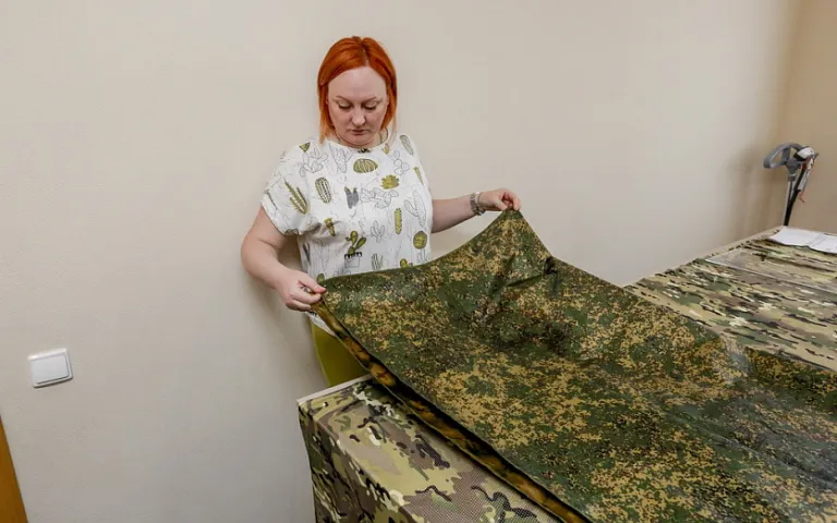 На длинном столе готовят ткань, из которой будут кроить футболки, владелица магазина тканей,Ольга Груздева,помогает с первого дня начала СВО, ни минуты не задумываясь о своем решении.