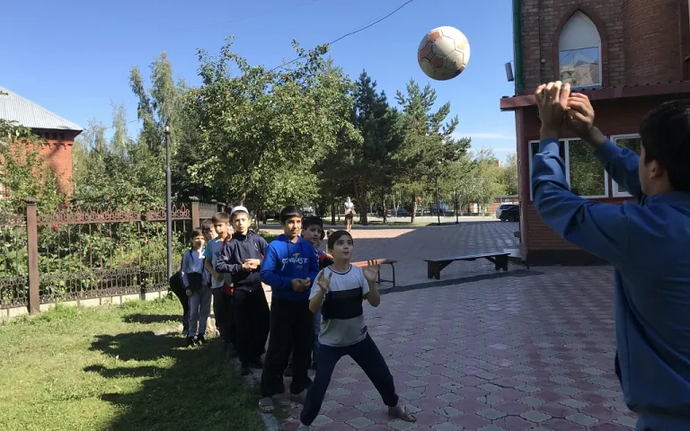 Когда заходишь во двор соборной мечети на улице Красина, первое, что тебя встречает – детский смех. Веселые звонкие мальчишеские голоса на разных языках что-то обсуждают и спорят. Веселая стайка ребят в сопровождении сотрудника мечети спускается со второго этажа и бежит играть в мяч на поляну.