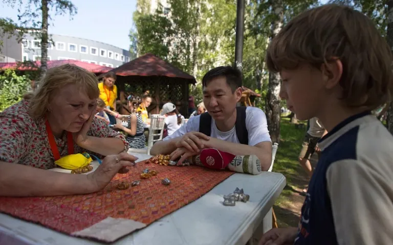 В тени берез можно было сыграть в национальные настольные игры. Нарды, арабское домино и бурятская игра в кости «Шагай наадан» собрали множество любителей интеллектуальных битв.