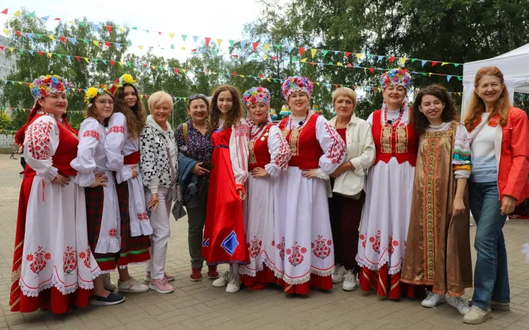 На площадке перед главной сценой парка «Березовая роща» была представлена выставка- презентация «Многонациональная деревня», которую представили национальные организации и учреждения города, среди них :