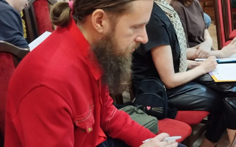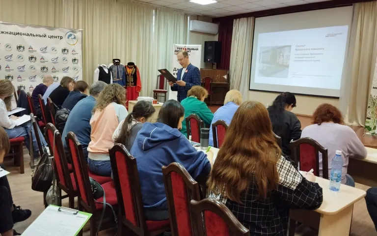 В Городском межнациональном центре звучала вторая часть диктанта «Косточка мамонта». После видеопрочтения автора текст читал и диктовал шеф-редактор сайта ГТРК «Вести. Новосибирск» Максим Безбородов. Это опытный участник акции, он диктует тексты уже восьмой год подряд.