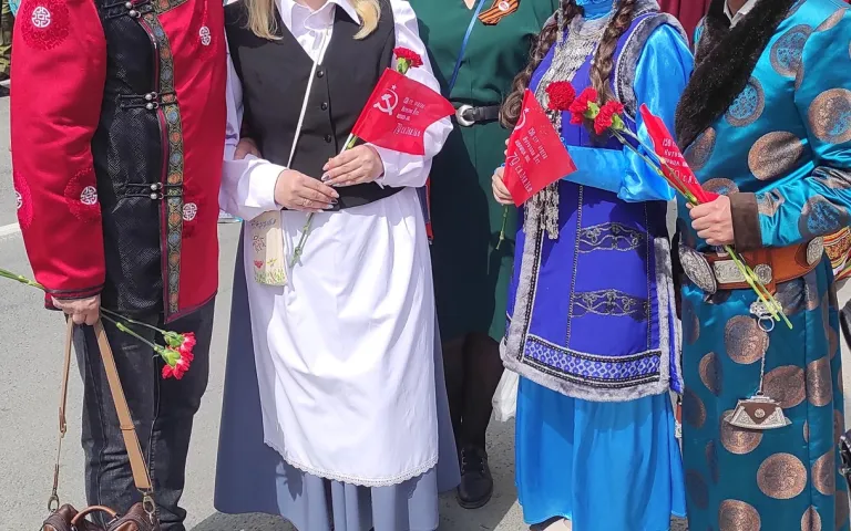 В составе колонны под флагом России и Знаменем Победы к Вечному огню прошли руководители и представители национально-культурных организаций, автономий и землячеств в костюмах своих народов. Городской межнациональный центр подготовил группу молодых активистов, которые включились в шествие в национальных костюмах, изготовленных в рамках гранта Министерства региональной политики Новосибирской области.