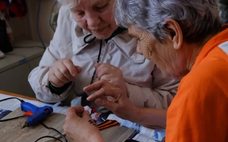 В ходе мастер – класса устроенном ОО «МОСРГН НОО ВОИ» в РЦОО ул. Новоморская, 12 желающие сделали себе подарок ко Дню Победы - красивую брошь из георгиевской ленточки.