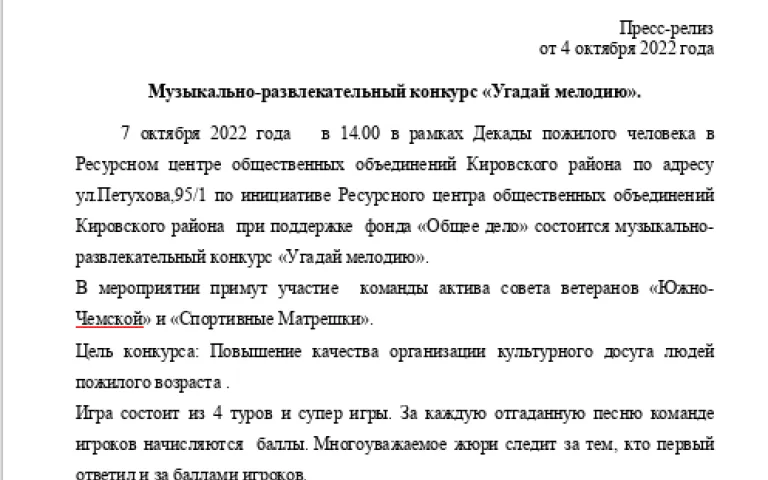 7 октября 2022 года в 14.00 в рамках Декады пожилого человека в Ресурсном центре общественных объединений Кировского района по адресу ул.Петухова,95/1 по инициативе Ресурсного центра общественных объединений Кировского района при поддержке фонда «Общее дело» состоится музыкально-развлекательный конкурс «Угадай мелодию».