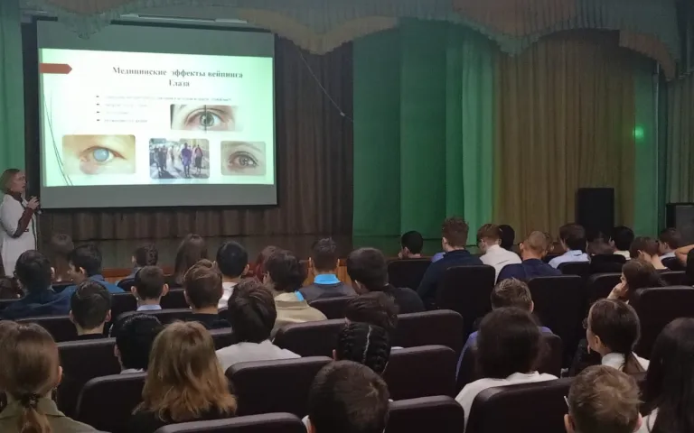 12.01.2024 заведующая терапевтическим отделением клиник «Семейный доктор» г. Новосибирска Евгения Белёвская прочитала лекцию о вреде вейп культуры для учеников 7-х и 8-х классов 56-й школы.