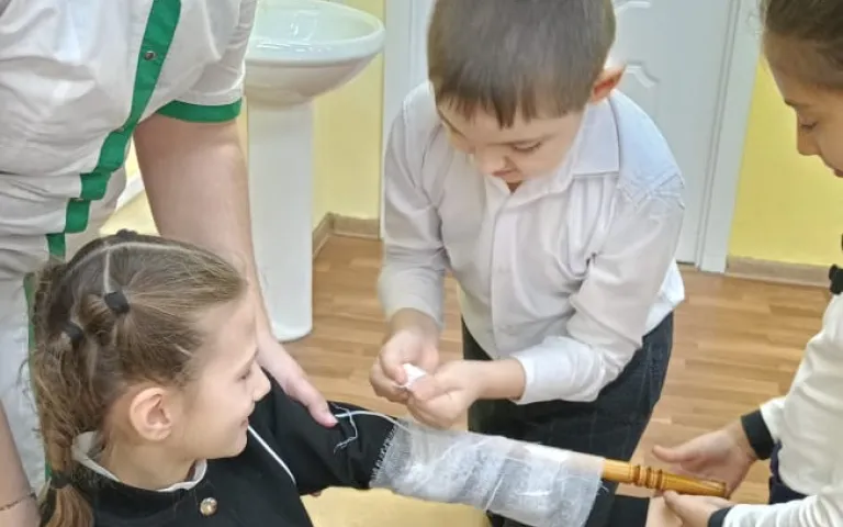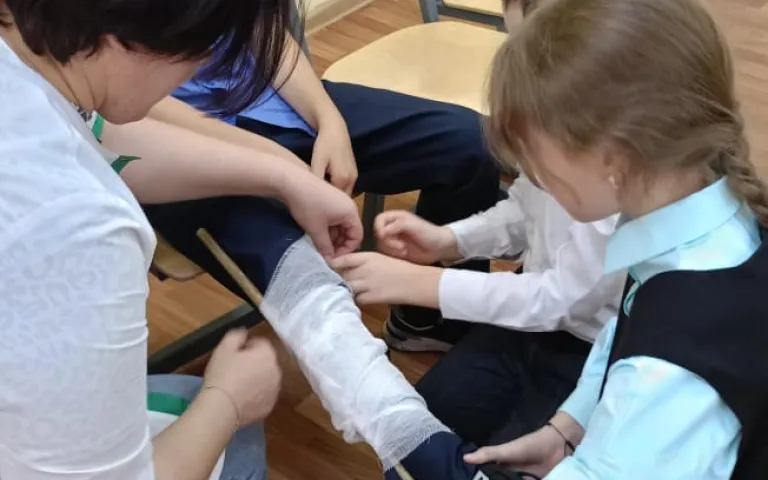 Во время мастер-класса ребятам рассказали, как правильно передать информацию диспетчерам для вызова скорой помощи. Ребятам показали, как накладывать фиксирующую повязку, останавливать кровотечение.
