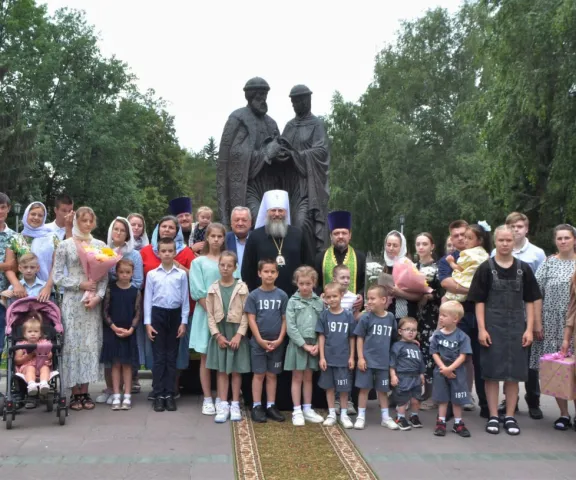 По окончании молебна владыка Никодим возложил цветы к памятнику святым Петру и Феронии и поздравил собравшихся с Днем семьи, любви и верности. Владыка напомнил о том подвиге, который совершили святые Петр и Феврония ради сохранения своей семьи: они готовы были отказаться от власти, почитания, богатства. Сегодня мы празднуем память святых благоверных Петра и Февронии Муромских, и в этот день в честь из памяти совершается празднование и Дня семьи, любви и верности. «Пример благоверных Петра и Февронии напоминает нам о том, что нет ничего ценнее семьи, пример того, насколько важна любовь, насколько ценна семья, насколько богатство, слава, честь не играют никакой роли для семьи. И сегодня в этот радостный день мы чествуем тех, кто достойно прошел путь семейной верности, кто, несмотря ни на какие искушения этого мира, ни на бедствия, ни на горести, сохранил верность семейным узам, и все, кто видят эту семью, радуются, что есть такие люди, которые чтут святость семьи».