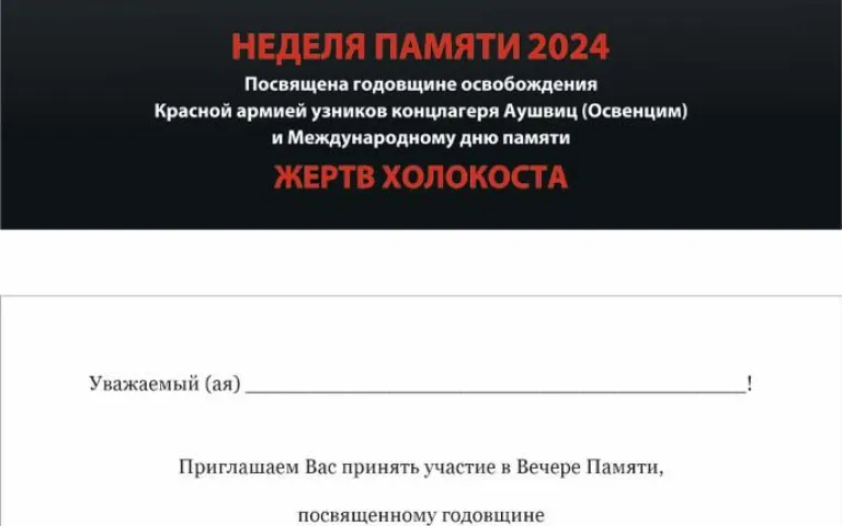 Вечер памяти, посвященный годовщине освобождения красной Армией узников концлагеря Аушвиц и Международному дню памяти жертв Холокоста, пройдёт 29 января 2024 года в 18-00 часов в ДК Октябрьской революции, ул. Ленина,24.