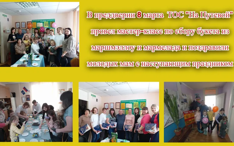 Выберите оценкуGive it 1/5Give it 2/5Give it 3/5Give it 4/5Give it 5/5 Город соседей 04.03.2023 В преддверии 8 марта ТОС «На Путевой» провел мастер-класс по сбору букета из маршмэллоу и мармелада ТОС «На Путевой» Просмотров: 16 В преддверии 8 марта ТОС «На Путевой» провел мастер-класс по сбору букета из маршмэллоу и мармелада и поздравили молодых мам с наступающим праздником Фотографии Image Отзывы