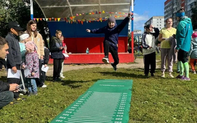 ребята играли в классики, прыгали через резиночку и в длину и через скакалку крутили обруч,