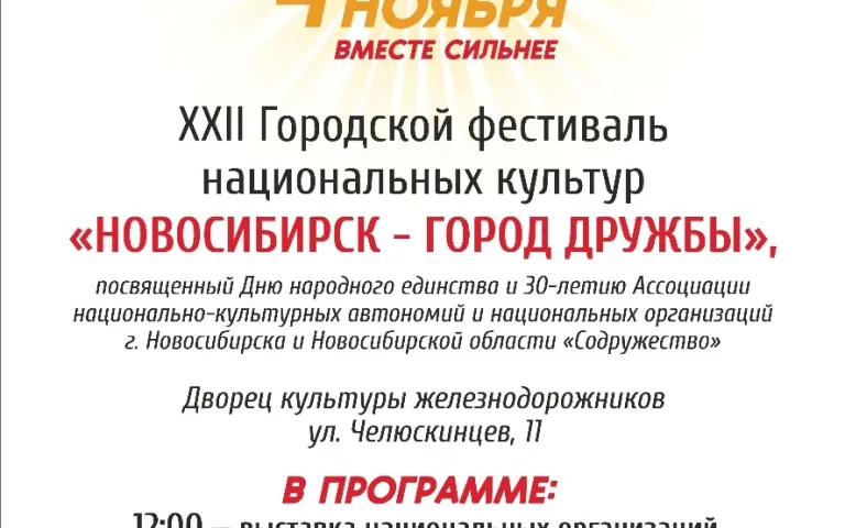 4 ноября в Доме культуры железнодорожников (ул. Челюскинцев, 11) состоится XXII Городской фестиваль национальных культур «Новосибирск - город дружбы», посвященный Дню народного единства и 30-летию Ассоциации национально-культурных автономий и национальных организаций г. Новосибирска и Новосибирской области «Содружество».