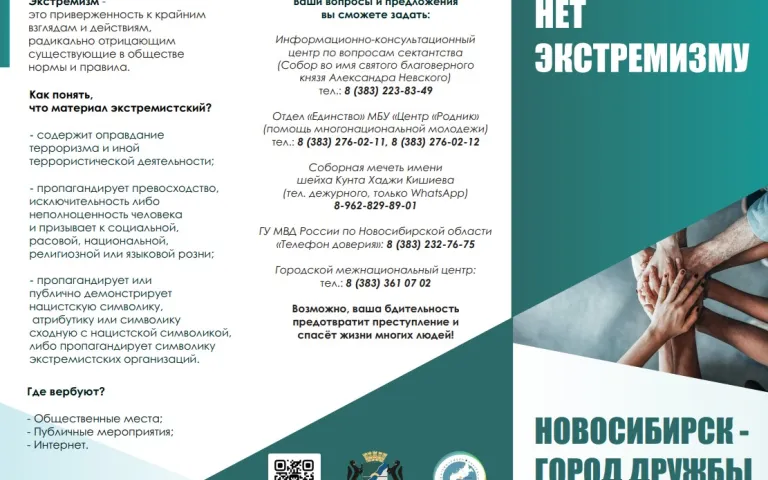 Раскрывает основные понятия, связанные с профилактикой экстремистских проявлений, содержит краткое описание принципов работы вербовщиков и содержит телефоны, по которым можно обратиться за помощью.